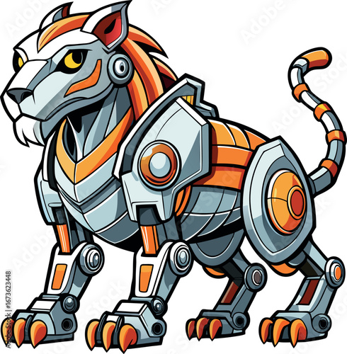 A whimsical, futuristic lion featuring bright, glowing LED eyes and a robotic body, showcasing a blend of nature and technology