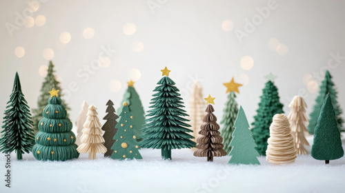 a white background with wooden Christmas trees and Papercut Christmas trees on fairy lights and bokeh. Isolated on pure white. 3d illustration. with copy space.