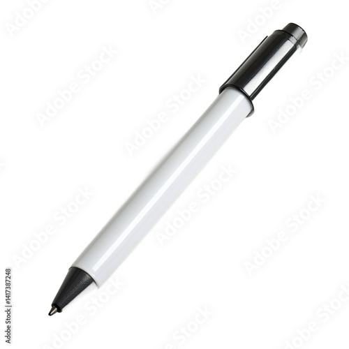 A white ballpoint pen angled diagonally, isolated against a plain white background.
