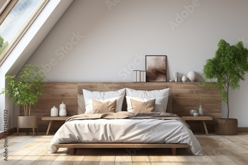A white bedroom with notes of brown color, a minimal amount of furniture and a stylish design for the room.