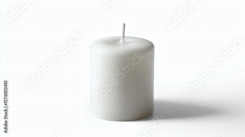 A white candle stands alone, its wick ready to be lit, on a clean white backdrop.