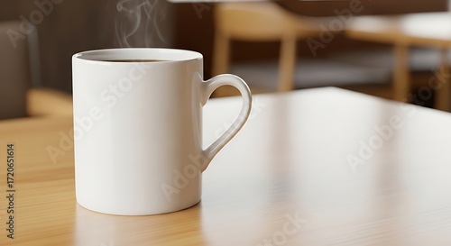 A white coffee mug sits on a light brown wooden table, steam rising gently from the dark brown liquid inside, creating a serene and inviting scene.