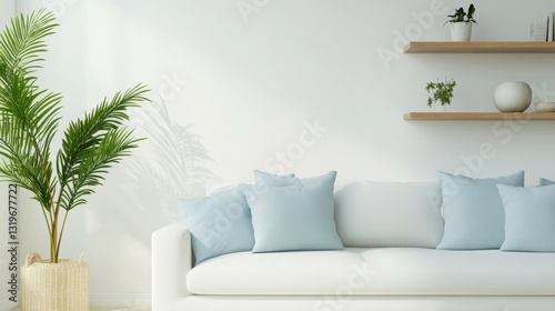 a white couch with blue pillows and a potted plant