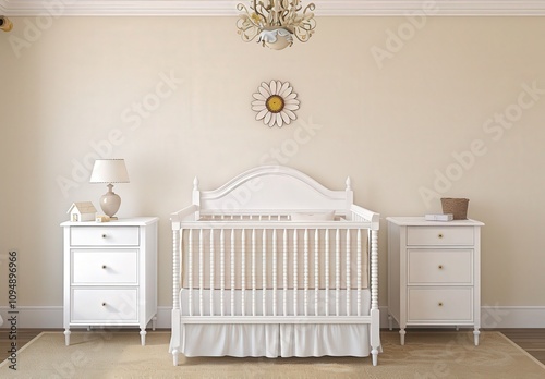 A white crib with a white canopy and white bedding in a nursery with a white dresser, lamp, and a yellow wall with butterflies and flowers
