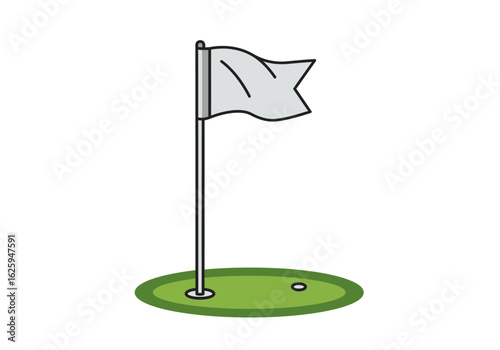 A white flag planted in a golf hole on a green course, representing the sport.
