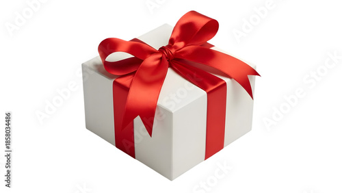 A white gift box is adorned with a vibrant red satin ribbon tied into a beautiful bow