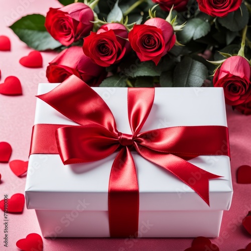 A white gift box with a red bow is framed by red roses and bokeh. Happy Valentine's Day, Mother's Day, 8 March, and Women's Day