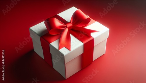 A white gift box with a red ribbon and bow, resting on a red background. The light casts a soft glow on the gift box, emphasizing its shape and texture.