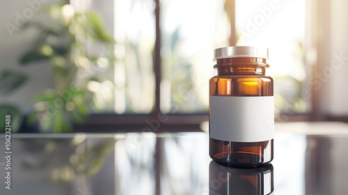 A white supplement bottle surrounded by green plants, placed on a white table, blending nature with health and wellness.