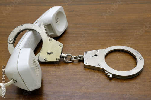 A white telephone receiver of a retro phone with steel police handcuffs lies on a brown table. The concept of fraud, deceit of the persecuted by law.