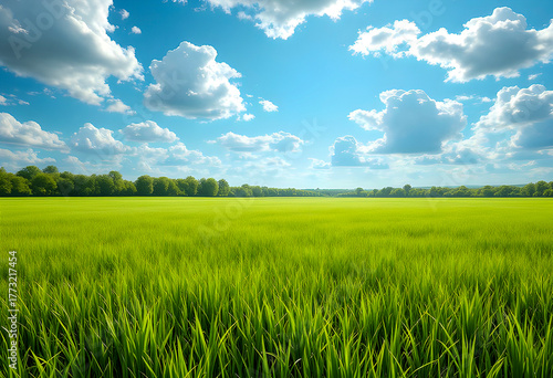 A wide open green field stretches under a vast blue sky filled with scattered fluffy white clouds creating a peaceful and calm landscape with a sense of space and freedom