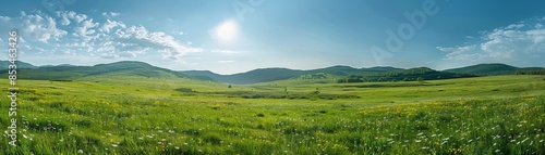 A wide panoramic shot of a lush green meadow with wildflowers, under a bright blue sky and sun, with rolling hills in the distance.