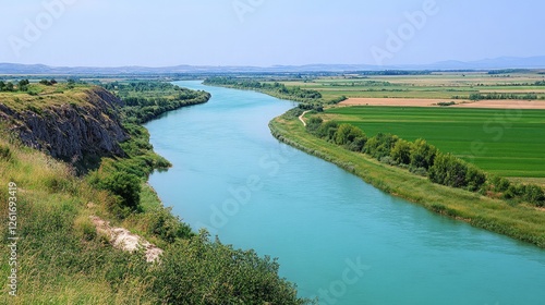 A wide river with a diversion dam channeling water into irrigation canals feeding adjacent farmlands under a clear sky.