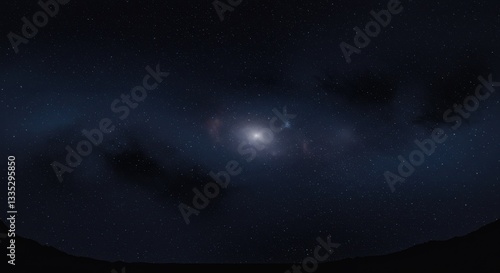 A wide-angle view of a dark night sky filled with numerous stars, centered on a bright, glowing star surrounded by faint nebulosity