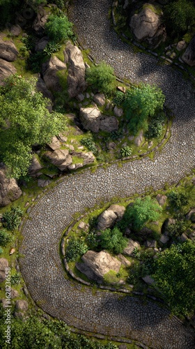 A winding cobblestone path with lush greenery on both sides, viewed from above
