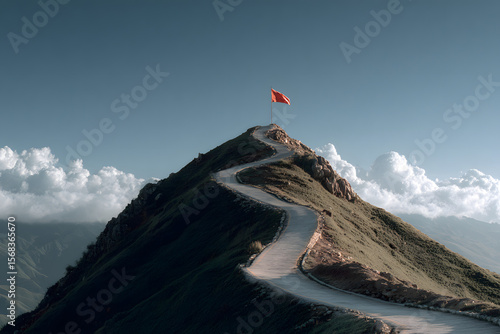 A winding road ascending a steep, isolated mountain peak topped with a flag, symbolizing the challenging journey to success