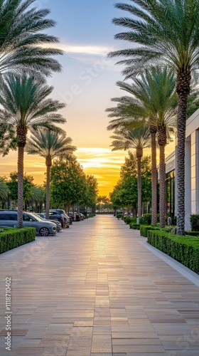 A winding road is framed by lush palm trees as the sun sets, casting warm hues across the sky in a serene suburban landscape during dusk.