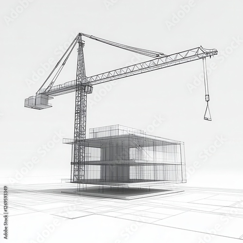A wireframe 3D render of a crane lifting a model building, transitioning into reality.
