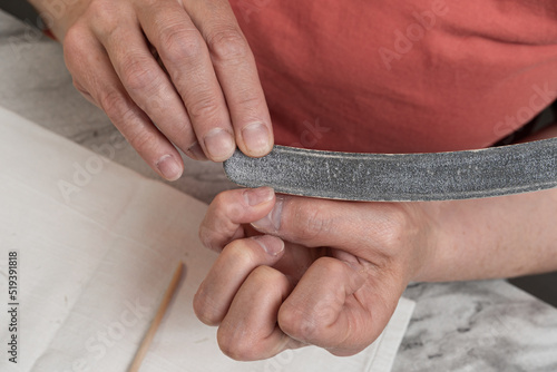 A woman does a manicure, sharpens her nails, smoothes her nails with an emery file for nails, takes care of her nails. Preparing the cuticle for cleaning and trimming. Top view very close up.