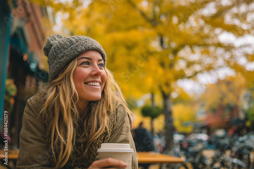 A Woman Enjoying a Coffee Outdoors on a Fall Day