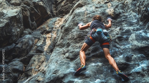A woman in a climbing harness scales a steep rock face.