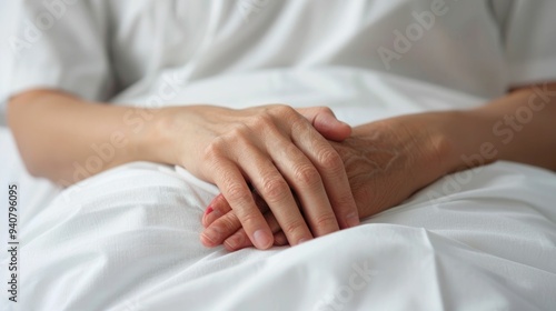 A woman in a hospital bed her hand gently clasped in the hands of a loved one seeking emotional support and comfort during her cancer treatment The scene conveys a deep sense of vulnerability