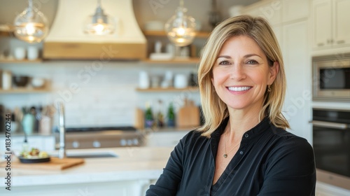 A woman in a kitchen with a white countertop and wooden cabinets.