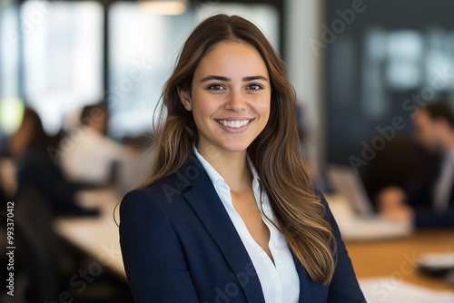 A woman in a navy suit smiles at the camera. Blurred office background