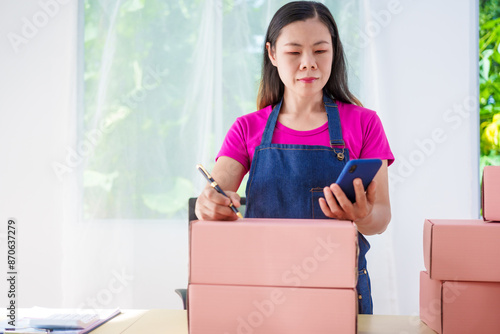 A woman in overalls sells products online, inspects parcels, takes customer orders, works at a desk, and uses pink boxes to pack items ready for shipping to customers.