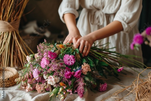 A woman is carefully arranging a beautiful bouquet of pink and purple flowers, showcasing her skill and artistry in floral design.