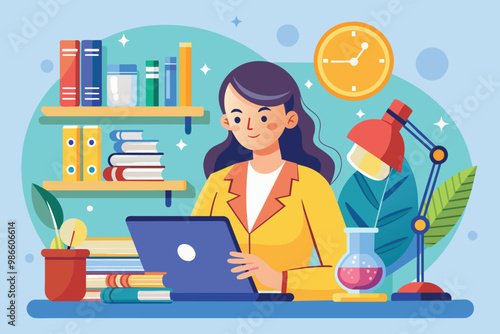 A woman is focused on her laptop while studying at her desk with a glass of liquid nearby, A woman studying with a glass in a flat illustration.