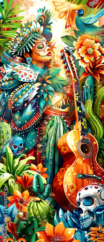 A woman is playing a guitar in a garden with cacti and flowers. The woman is dressed in a costume and has a flower on her head