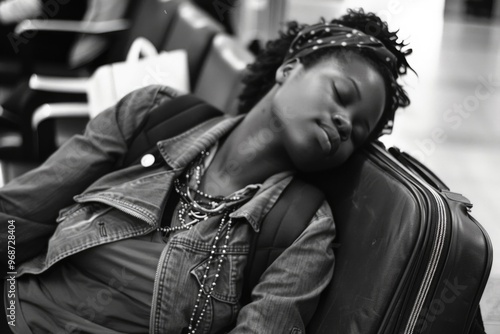 A woman is sleeping on a suitcase. She is wearing a blue jacket and a headband. The suitcase is black and has a zipper