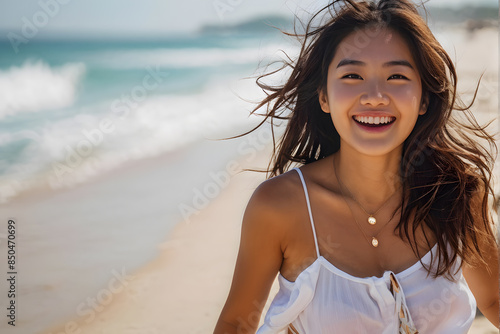 A woman is smiling and standing on the beach