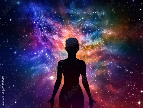 A woman is standing in a colorful galaxy. The galaxy is full of stars and has a vibrant, otherworldly feel to it. The woman is looking up at the stars