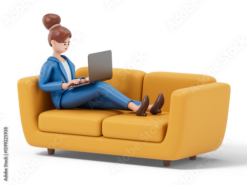 A woman lounges on a yellow sofa while using a laptop, symbolizing the comfort and flexibility of working from home. 3D rendering, conceptual image. Isolated on white background.