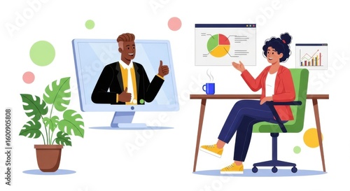 A woman sits at a desk analyzing charts on a computer screen while a man gives a thumbs up on another screen symbolizing online