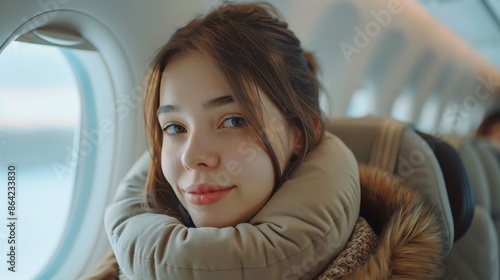 a woman sits on an airplane near the Porthole, she has a special travel pillow on her neck, real photo, 4K,