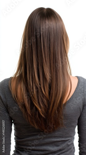A woman stands with straight hair flowing down her back, seen from behind in a neutral setting. The simplicity of her hairstyle suggests a moment of tranquility and introspection