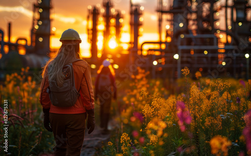 A woman wearing a hard hat and orange jacket walks through a field of flowers. The sun is setting in the background, casting a warm glow over the scene.