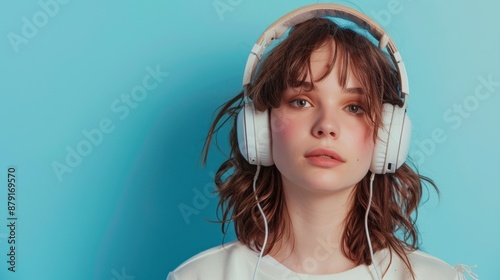 A woman wearing headphones and a white shirt