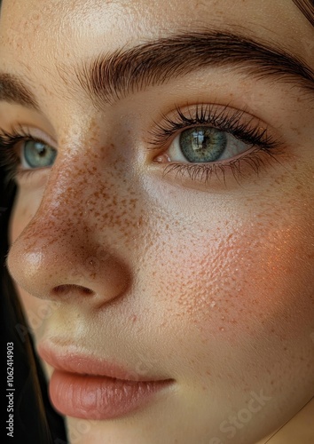 A woman with a blue eye and a nose with freckles
