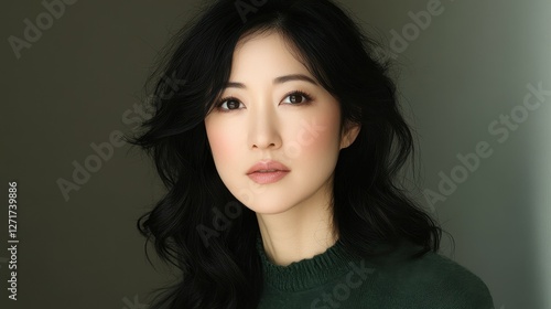 A woman with long black hair and a green sweater. She has a serious expression on her face