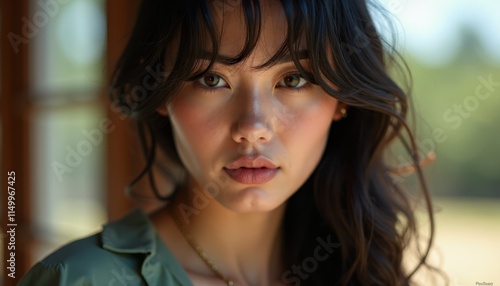 A woman with long dark hair and a green shirt