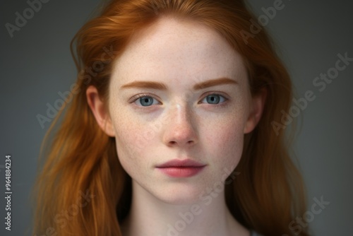 A woman with red hair and blue eyes