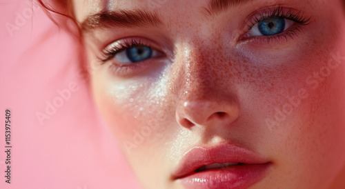 A woman with striking blue eyes and flawless skin gazes directly at the viewer, highlighting her natural beauty against a soft pink background during daytime.
