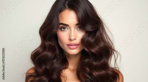A woman with voluminous dark hair poses confidently, showcasing her healthy hair and radiant complexion