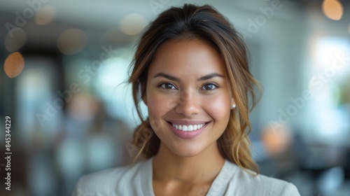 A woman with warm brown eyes and a bright smile looks directly at the camera, her face illuminated by the soft light of a modern city