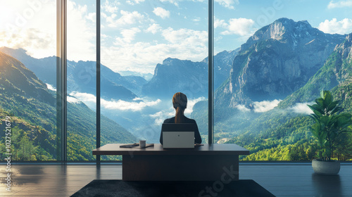 A woman working on her laptop while seated at a table in front of a large panoramic window, offering a breathtaking view of the mountains. Symbolizing the concept of remote work and escaping