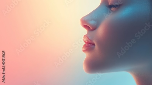 A woman's face is shown with a pink background